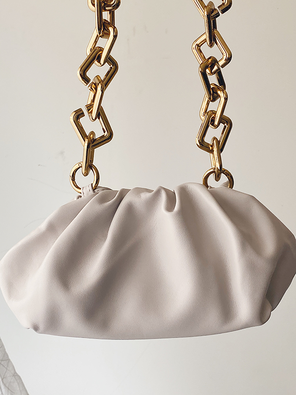 Pochette en cuir femme avec une sangle amovible en colori Crème. Ainsi que sa anse en chaine à gros maillons dorée.