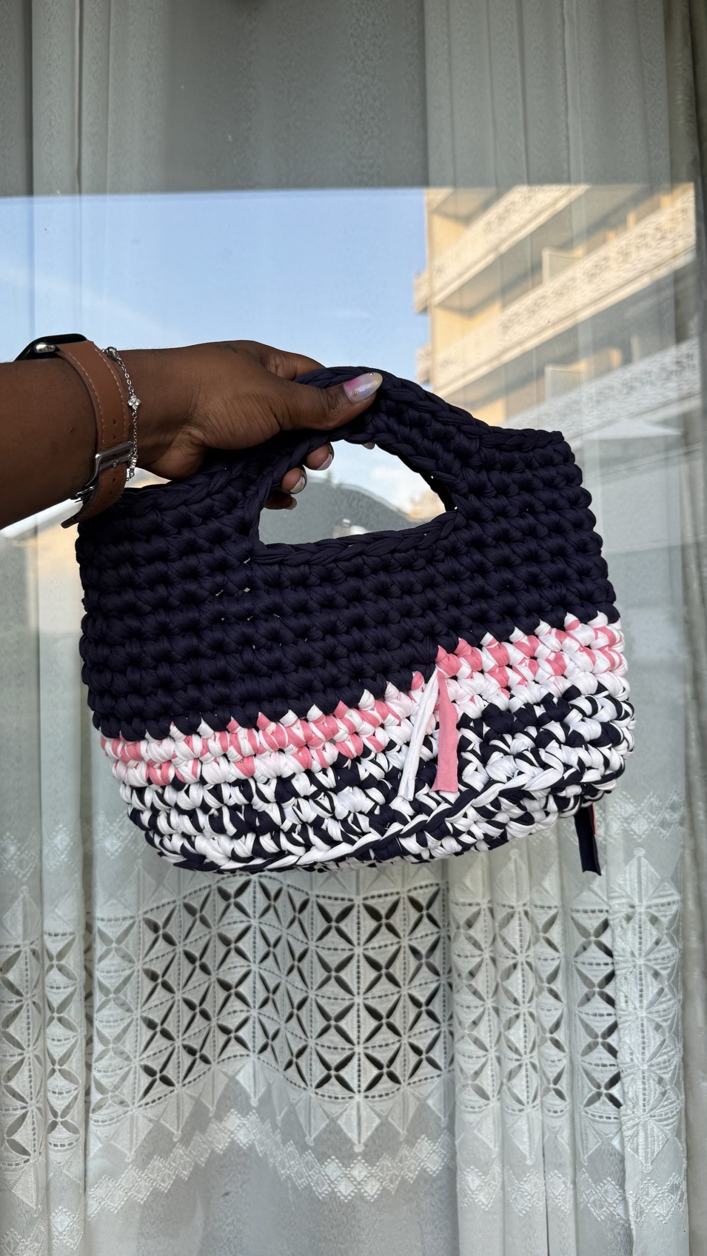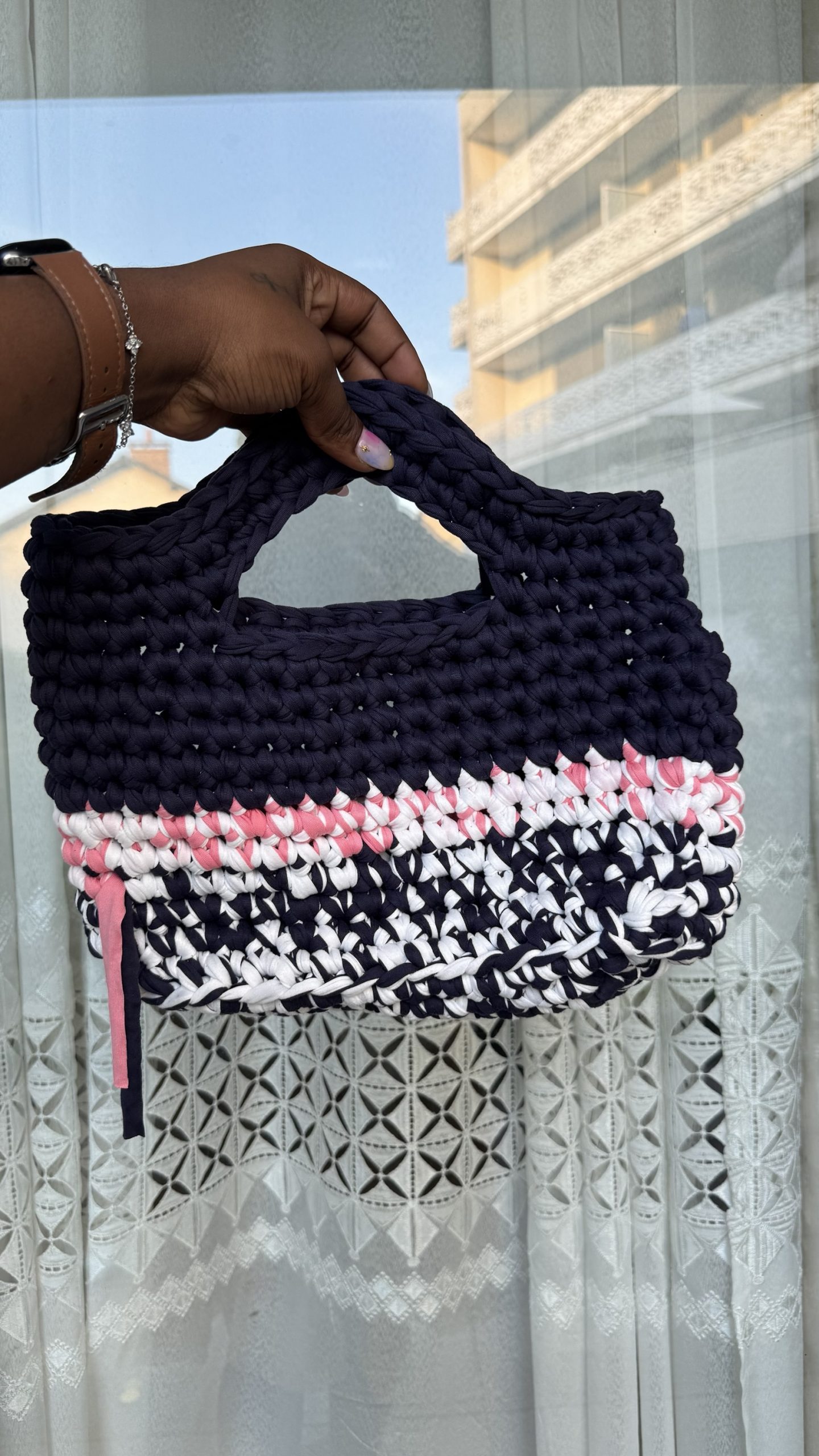 Ici en version médium et en colori navy blue un mélange de bleu de rose et de crèmes . Je peux te servir de sac de sortie de jour comme de nuit.
